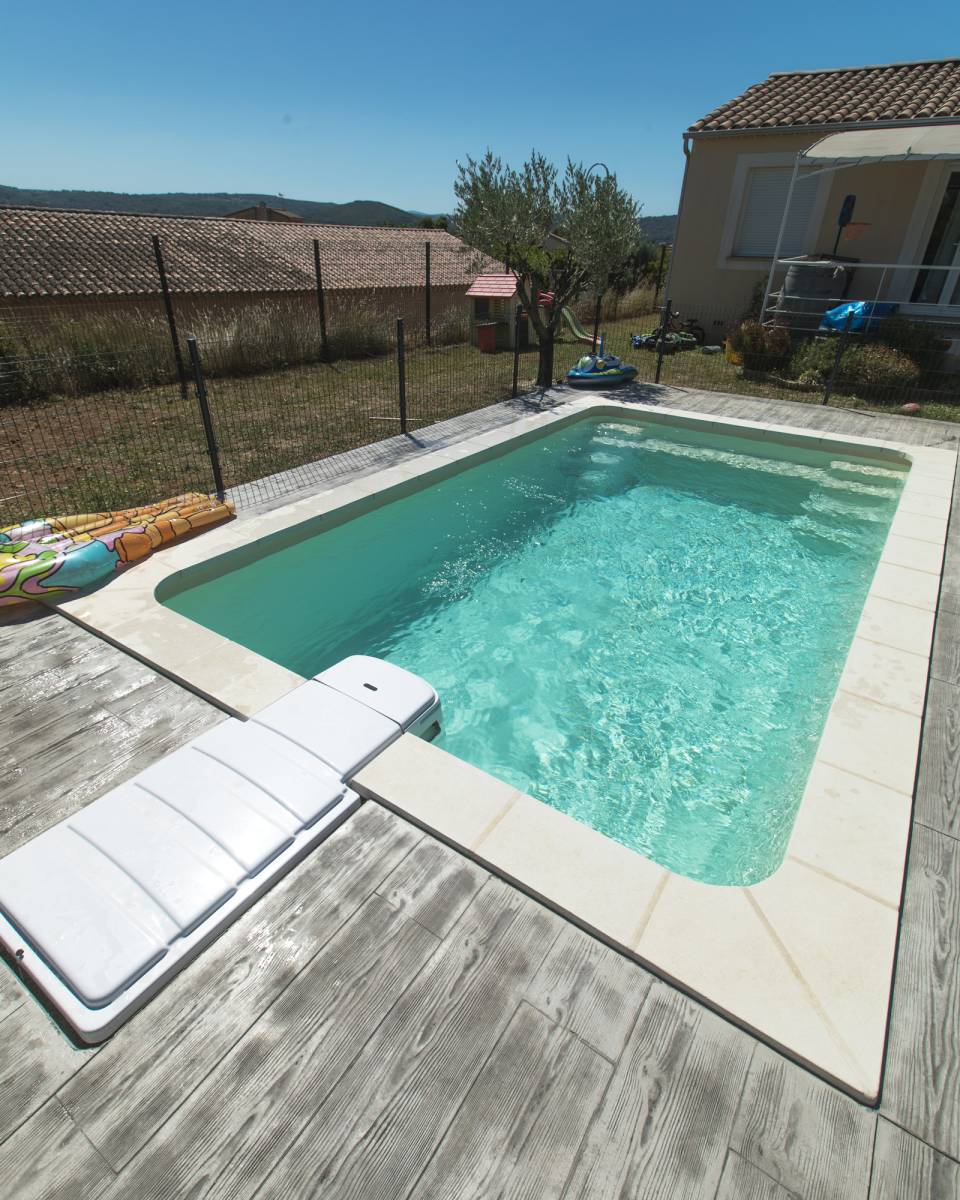 Vous découvrez ici l'une de nos réalisations piscines sur Carcassonne. Cette piscine coque polyester est le modèle 630 BF. Rectangulaire, avec ses 6.30 m x 3.20 m, cette piscine offre un style très contemporain renforcé par son double escalier d'angle aux lignes épurées très original ! Ces escaliers d'angles, grâce à leur faible encombrement, permettent de préserver de manière optimale la surface de nage pour que famille et amis profite pleinement des joies de la baignade dans le plus grand confort ! Pour vos moments de détente vous disposerez d'une banquette centrale .