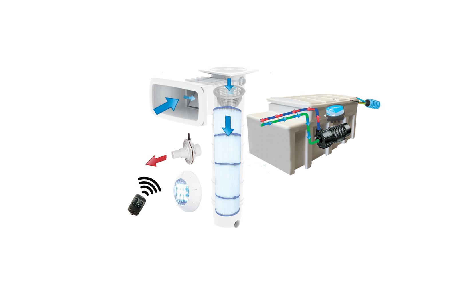 Principe de fonctionnement de la filtration : L’eau est aspirée à la surface de la piscine par le skimmer et arrive à la pompe qui la rejette après avoir traversé la cartouche filtrante et s’être débarrassée de toutes impuretés qu’elle contenait. L’eau retourne ensuite dans la piscine par la buse de refoulement.