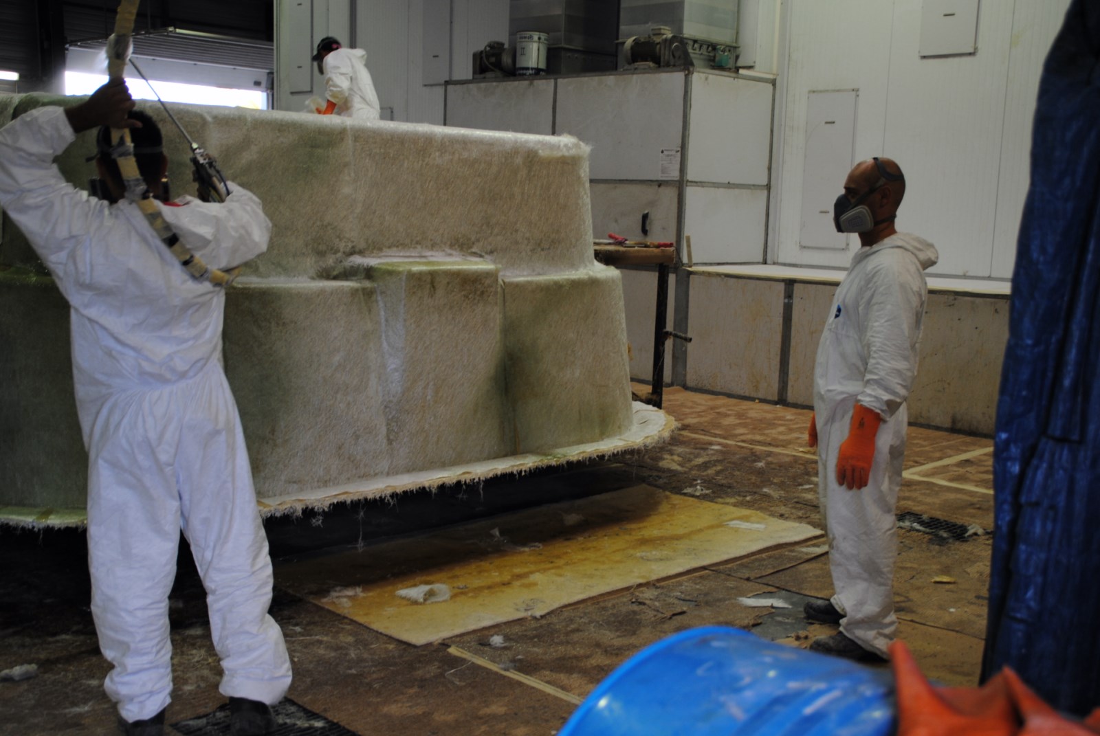 Une fois la " première peau " polymérisée, plusieurs couches successives de tissus de verre et résine sont appliquées. Toutes ces couches ébullées séparément forment l'armature de la piscine. La dernière couche de tissus de verre est appellée " complexe de verre " ou " rowing mat ". Ce tissus indéchirable permet une resistance optimale de votre piscine.