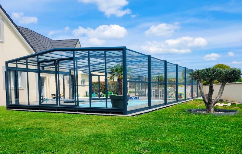 Ainsi avec une hauteur de 2,20m à l'angle le plus bas de l'élément, l'abri haut fixe offre un bel espace de vie pour profiter de votre piscine tout au long de l'année. Votre piscine d'extérieur devient une piscine d'intérieur qui peut s'ouvrir sur votre jardin.
